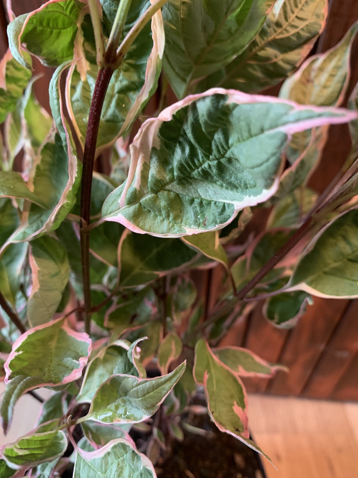 Látványos rózsaszín tarka lombozat jellemzi.