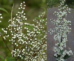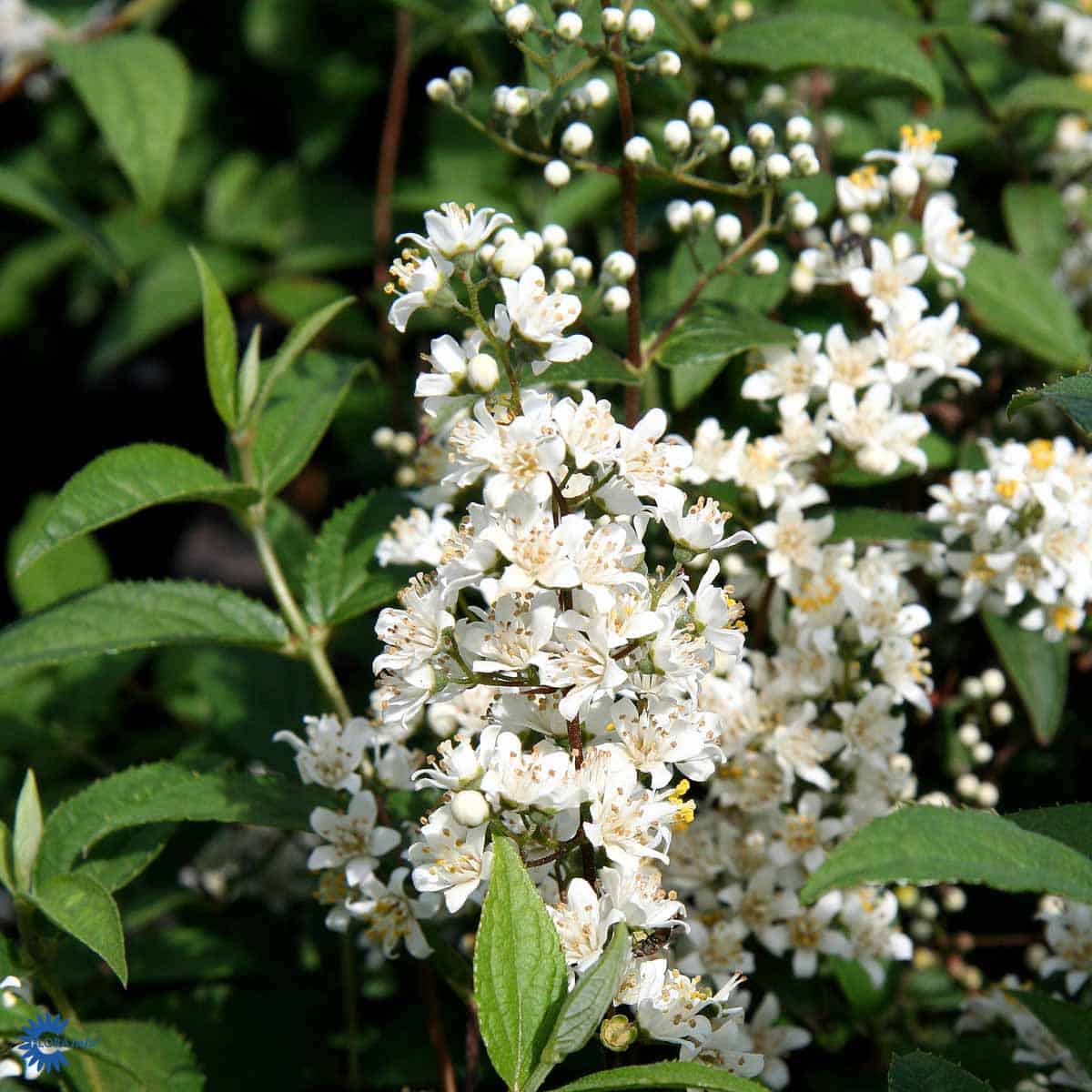 Középmagas, karcsú lombhullató díszcserje krémfehér virágokkal.