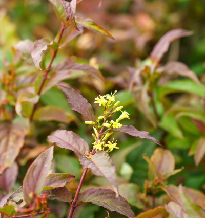 Ágvégi csomókban álló kis, csöves virágai sárgás színűek. Nyár közepétől nyílnak és szép kontrasztot adnak a szines lombbal.