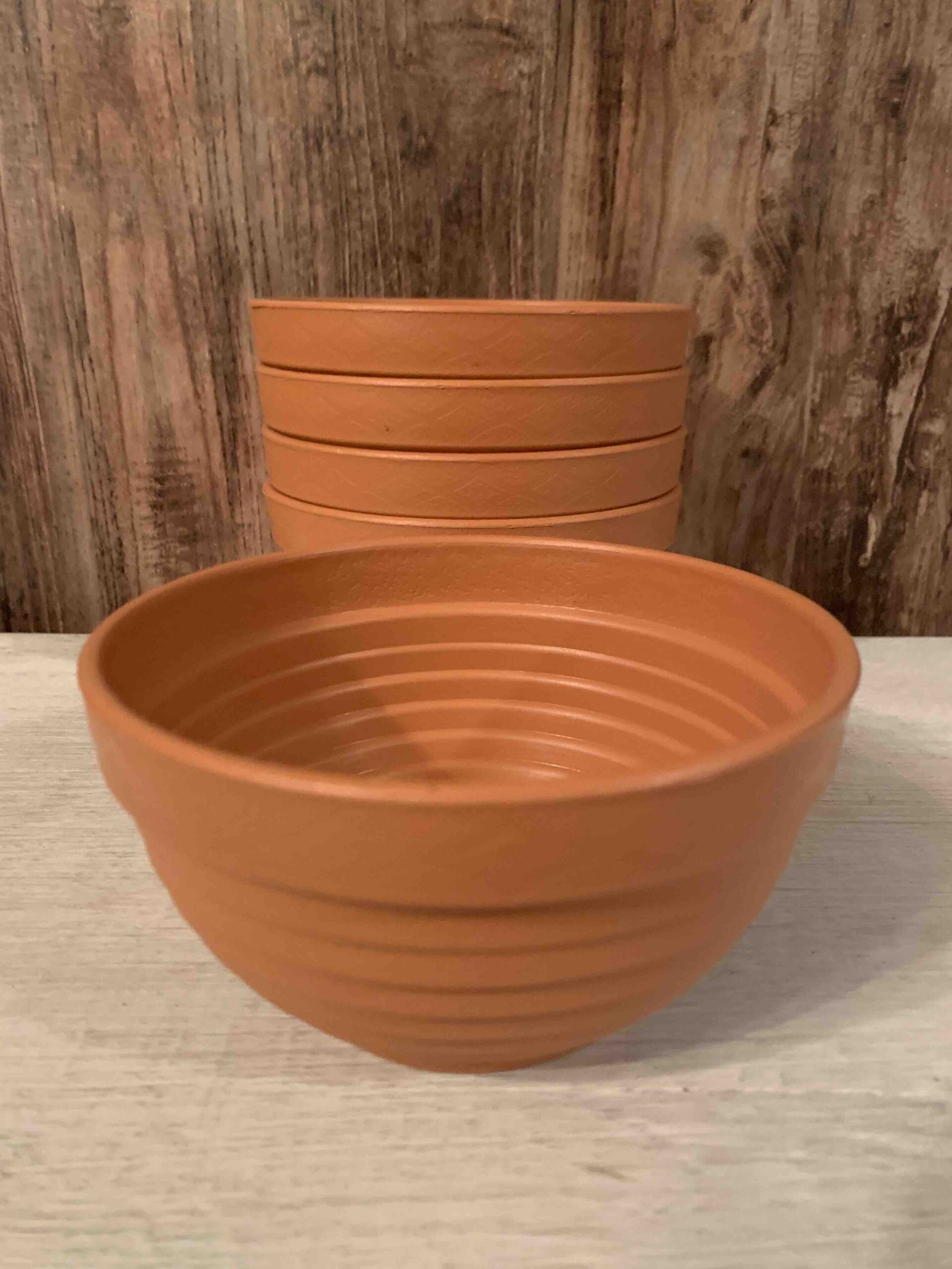 Vízszintesen bordázott műanyag virágkaspó barna színben.