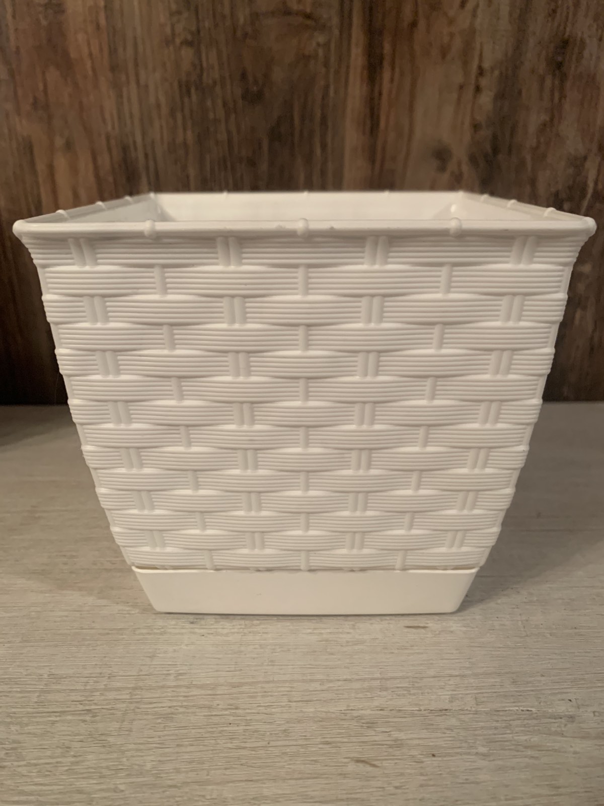 Szögletes kialakítású műanyag virágcserép. Felülete bordázott, fonott hatást kelt.