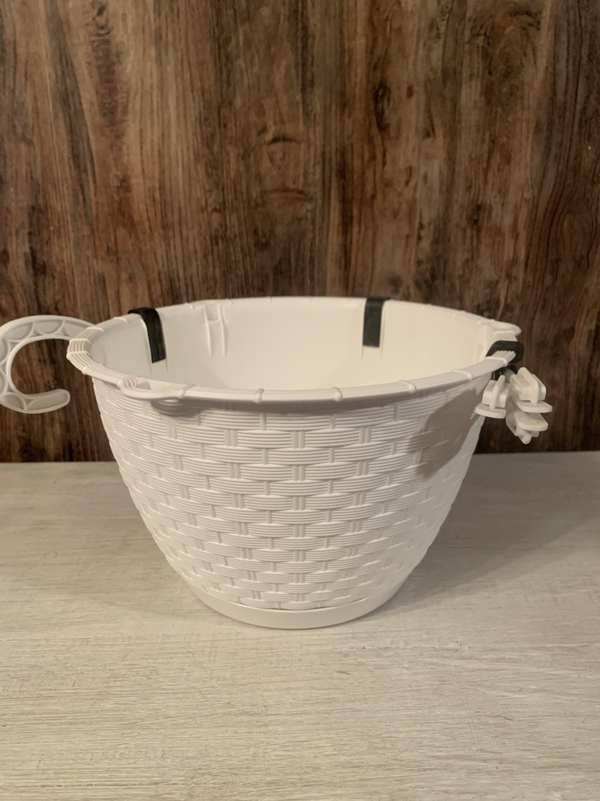Kerek, akasztós műanyag virágcserép. Felülete bordázott, fonott hatást kelt.